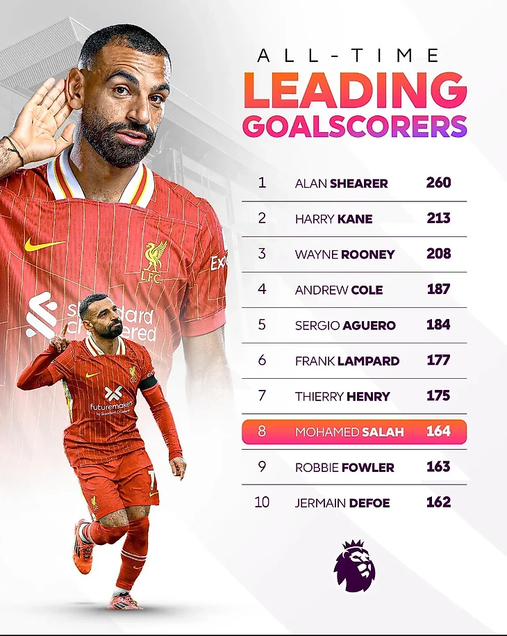 Более того, сегодняшний гол в ворота «Брайтона» позволил египтянину обойти Робби Фаулера и стать восьмым в списке лучших бомбардиров АПЛ.