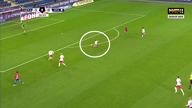 Частично спокойствие в ответных контратаках связано с плохими решениями ЦСКА: например, Аббос Файзуллаев не исполнил на Облякова (потащил Наиль Умяров), а Матвей Кисляк притормозил похожий перспективный выход.