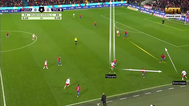 При этом еще сработала ставка на правый фланг, где рубился Тео Бонгонда. Мойзес справился с большинством эпизодов: удары были не опасны, не ошибался 1-в-1. Но единственный идеальный эпизод «Спартак» реализовал. И главный герой – не Бонгонда, а Пруцев с быстрым пасом в такт Тео, это позволило обыграть стоячего Мойзеса на пространстве.