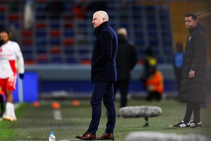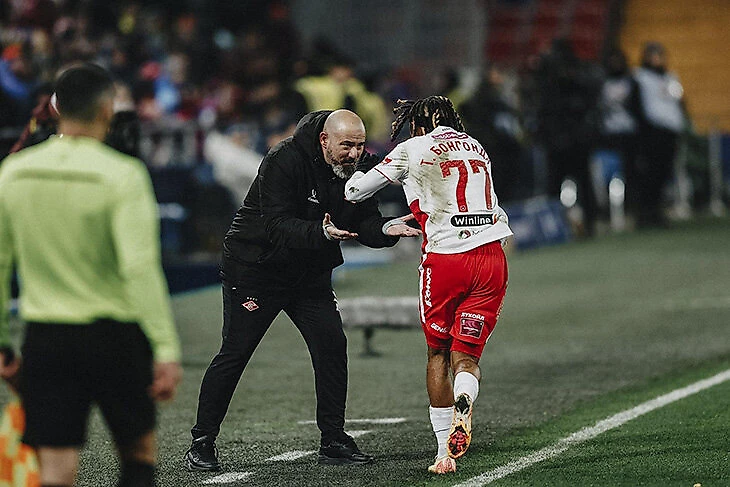 Главный тренер «Спартака» – противоположность. Он в черных кроссовках, спортивных штанах и длинном пуховике с эмблемой. Станкович ощутимо напряжен, постоянно машет руками, чтобы обратить на себя внимание футболистов – и что-то подкорректировать жестами. Деян практически выбегает на поле. Рядом с ним на фланге Даниил Денисов и Тео Бонгонда, и Станкович подсказывает Даниилу, как правильно отдать пас на Тео.