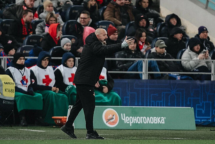 Главный тренер ЦСКА – максимально строгий. Николич в коричневых ботинках, брюках и полупальто. Держится строго, руки – в карманах. Марко не подавляет эмоции, иногда машет рукой, периодически поворачивается к штабу, смотрит на помощников, а потом на вип-трибуну прямо над скамейкой.