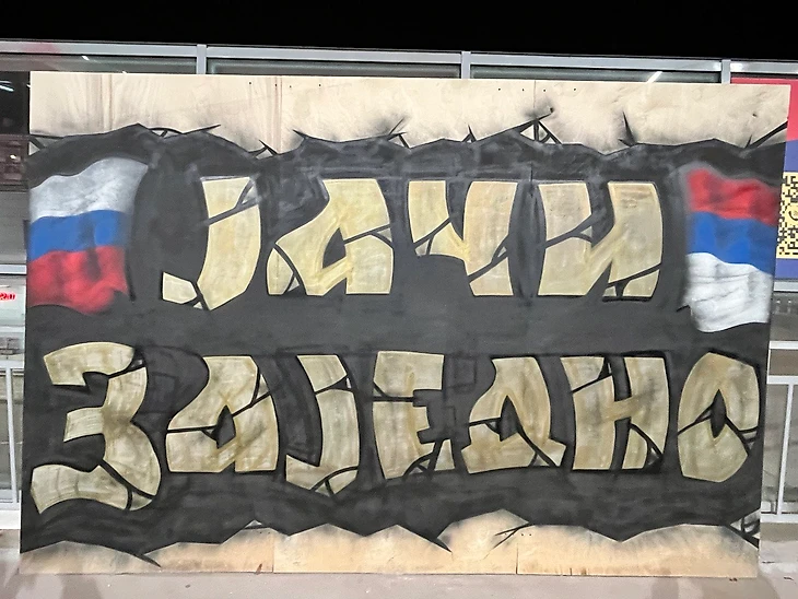 Огромный плакат с сербским и российским флагом и надписью Jaчи заjeдно («Вместе сильнее» – Спортс)