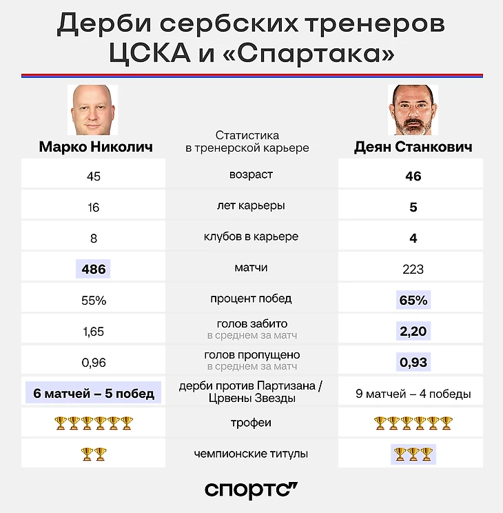 В этом дерби – еще одна новинка. Еще никогда не было тренеров-иностранцев из одной страны. До 2024-го ЦСКА и «Спартак» никогда не тренировали сербы. Теперь все сложилось. Причем у Марко Николича и Деяна Станковича есть символичная предыстория.