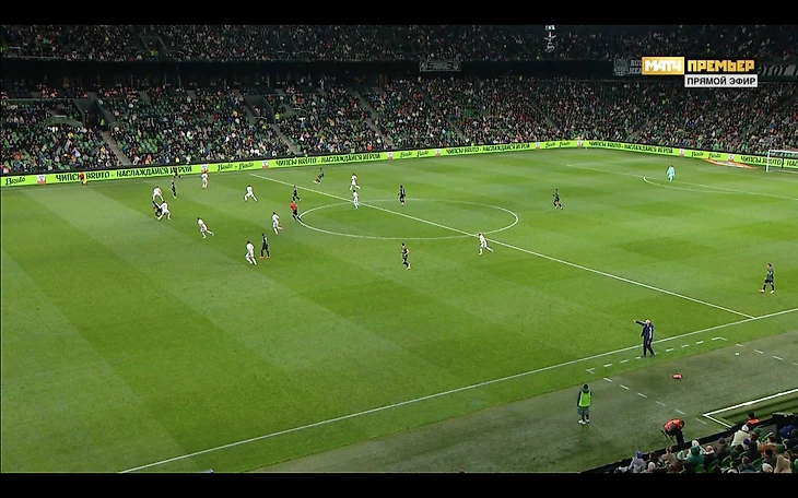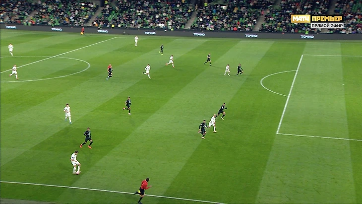 А вот спорный офсайд Джимми Марина зафиксировали – ответная атака «Краснодара» привела к результативному угловому.