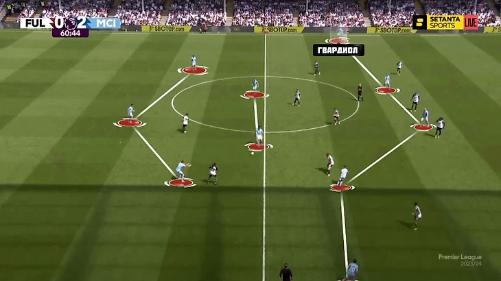 Во второй половине сезона Гвардиол стал все чаще и чаще подключаться выше. При позиционных атаках хорват начал занимать позицию левого вингера – в обороне оставалась привычная тройка центральных. Отчасти новая роль Йошко связана с повреждениями профильных крайних атакующих игроков – Доку и Грилиша.