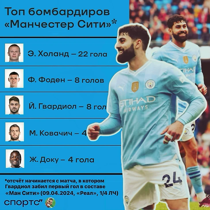 Если считать статистику игроков «горожан» во всех турнирах с момента первого результативного действия Гвардиола за клуб (гол в ворота «Реала», апрель 2024-го), то Йошко вновь оказывается на втором месте по забитым мячам.