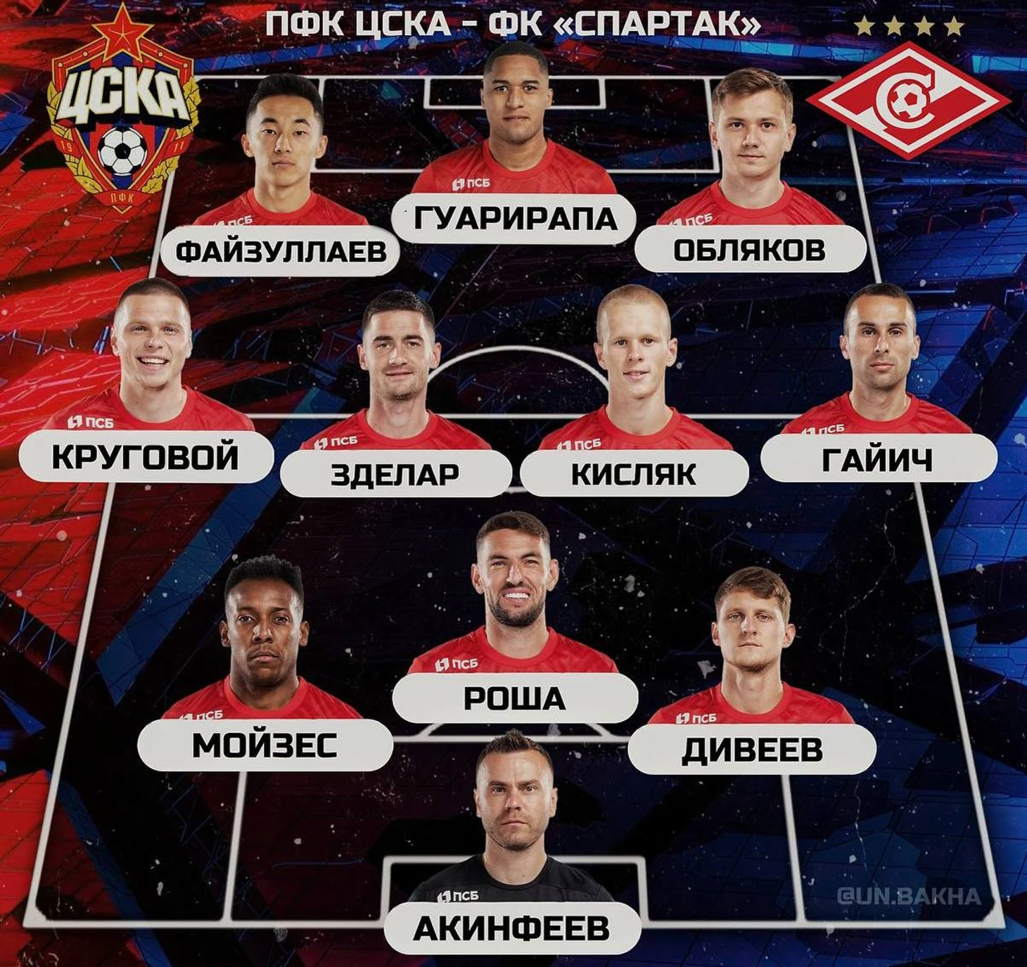 Армейцы вышли на матч со «Спартаком» в привычном сочетании 3-4-3, но в стартовую обойму было внесено несколько изменений. С первых минут в центре нападения сыграл Гуарирапа, а не Мусаев, в центре поля в паре со Зделаром вышел Кисляк вместо Пьянича, и на правом фланге встал Гайич вместо Келлвена. В остальном подбор игроков был очевидным и предсказуемым.