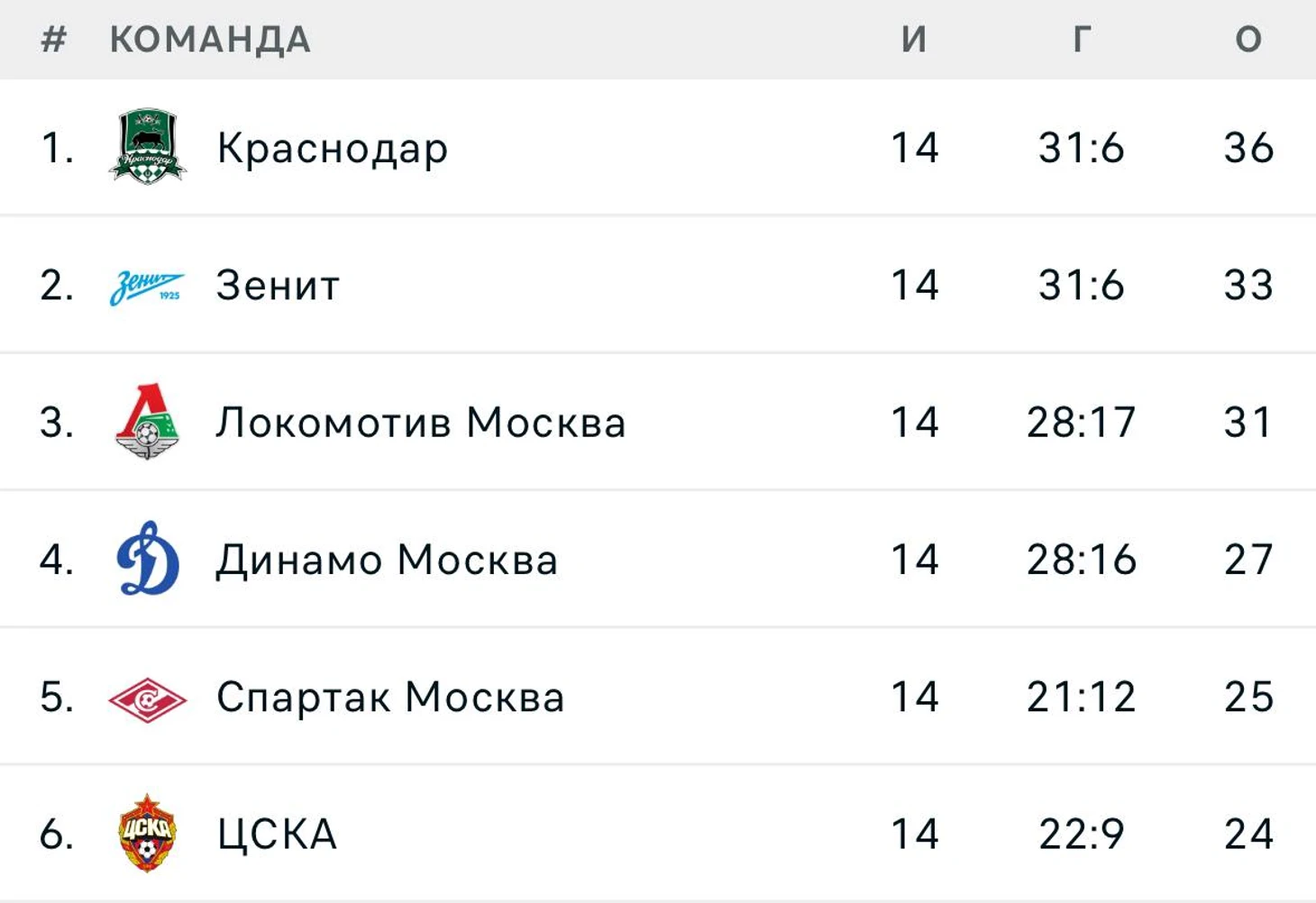 ЦСКА опустился на 6-е место в таблице РПЛ?
