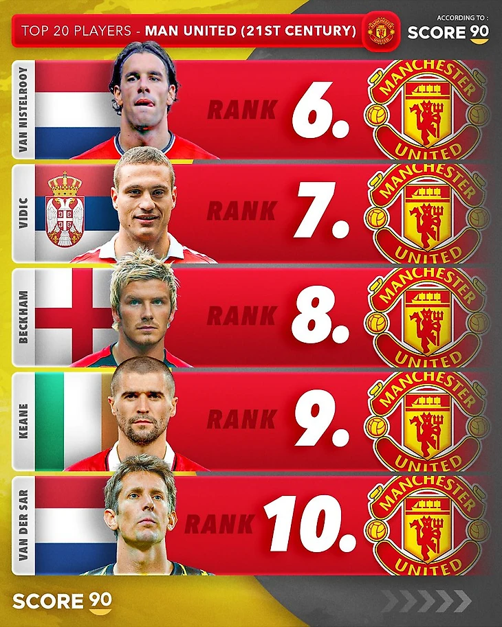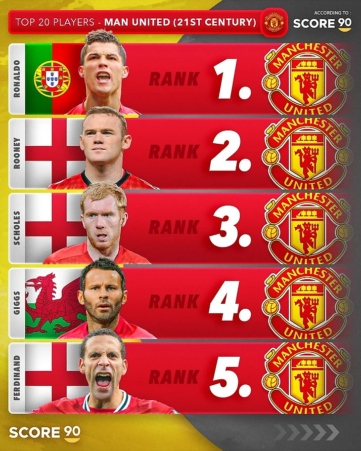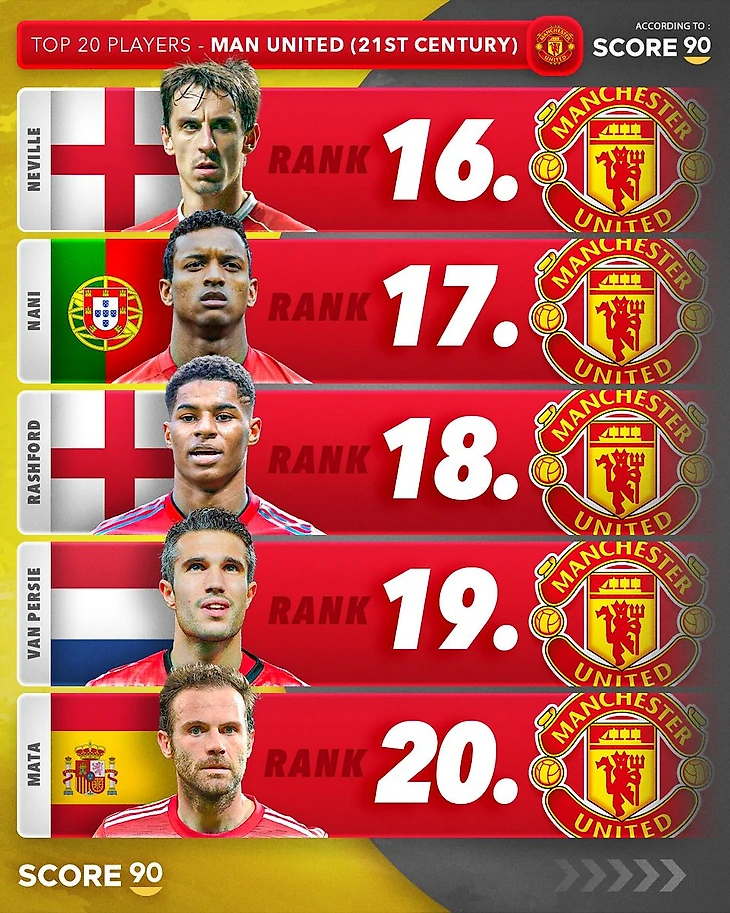 Тем не менее, в «Юнайтед» всегда были великие футболисты. Портал Score90 собрал двадцатку лучших в истории «МЮ» 21-го века. Места распределены с учетом уровня игрока в пиковой форме, продолжительности пика и влияния на клуб.
