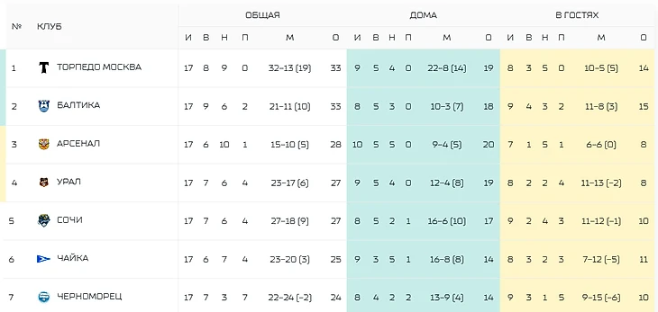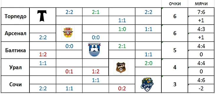 Для интереса можно еще посмотреть на такую таблицу междусобойчиков, поскольку при равенстве очков в первую очередь смотрят на личные встречи (поэтому «Урал» и опережает черноморцев, см. выше).