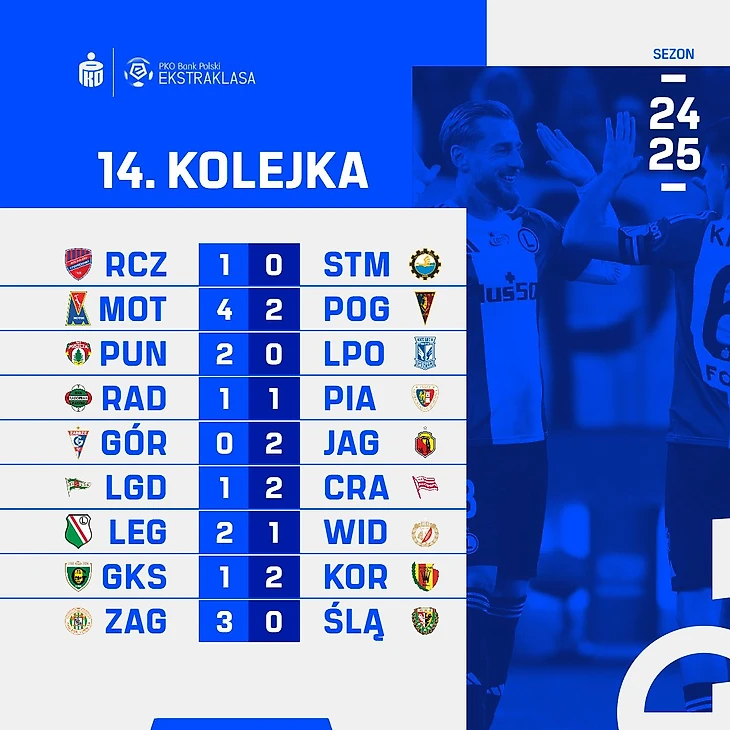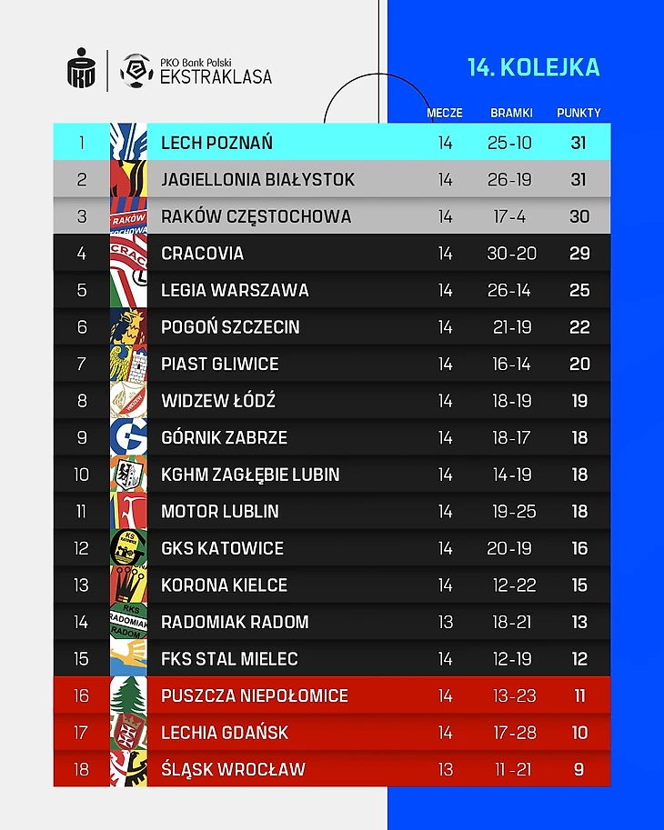 14-ый тур Экстракласы преподнес серьезную сенсацию – лидирующий в чемпионате «Лех» уступил замыкающей турнирную таблицу «Пуще», этим воспользовалась «Ягеллония», догнавшая познаньцев в турнирной таблице, а в Варшаве прошла классика 90-ых между «Легией» и «Видзевом».