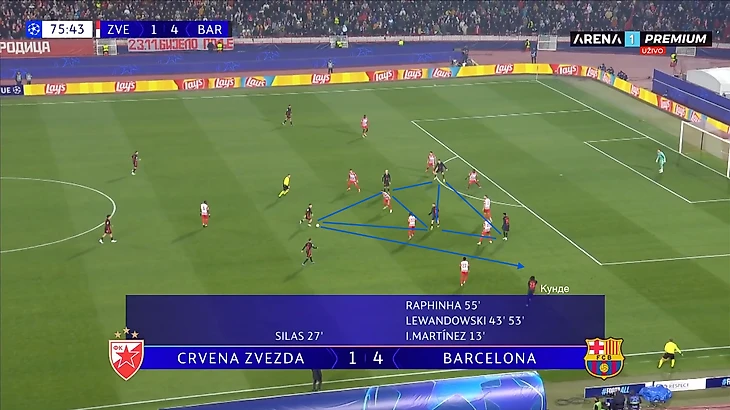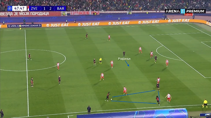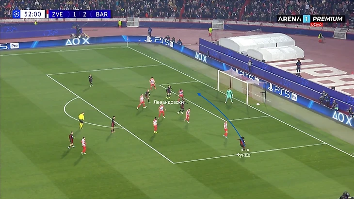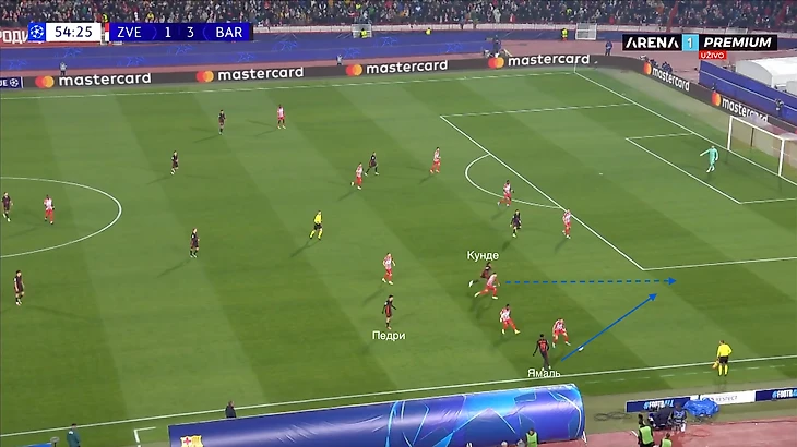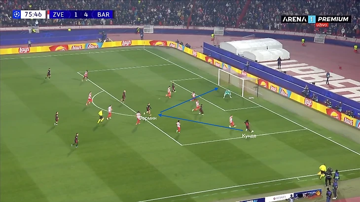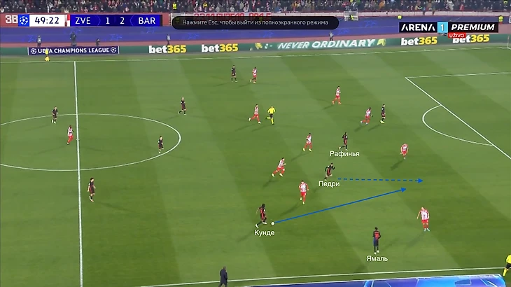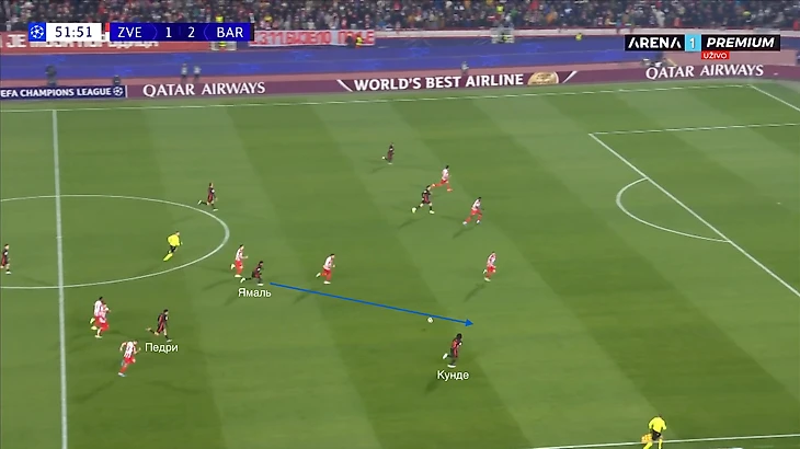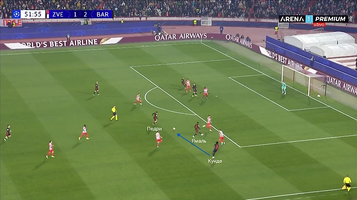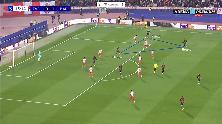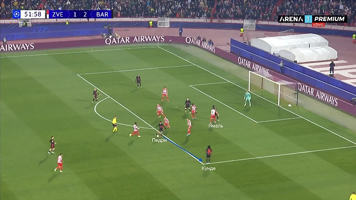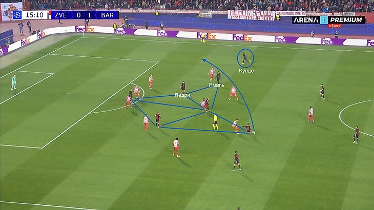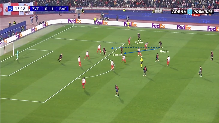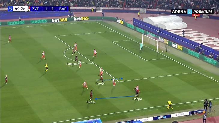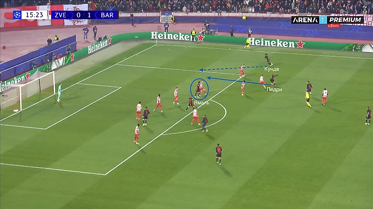 По итогу, Ямаль связывает игрока соперника, Педри получает пространство для движения с мячом, стягивая за собой оппонента. Эти действия открывают коридор для проникающей передачи на Кунде, который своевременно начинает делать рывок и атаковать зону за линией обороны «Црвены».