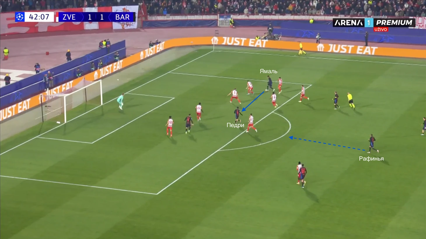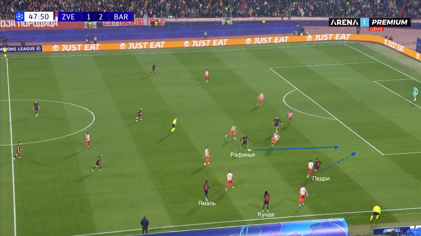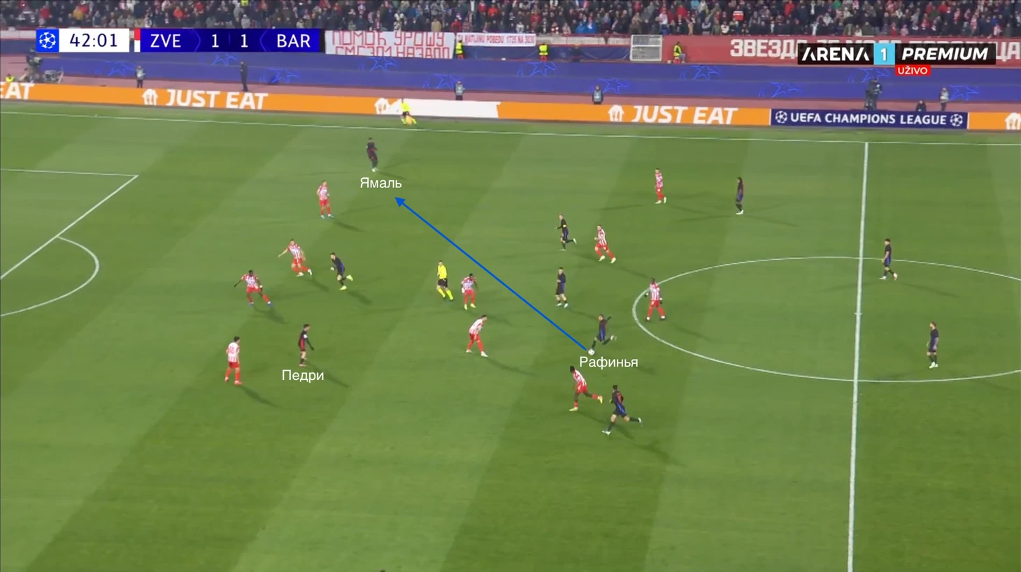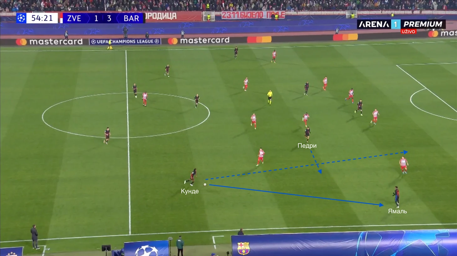 По итогу, Ямаль связывает игрока соперника, Педри получает пространство для движения с мячом, стягивая за собой оппонента. Эти действия открывают коридор для проникающей передачи на Кунде, который своевременно начинает делать рывок и атаковать зону за линией обороны «Црвены».