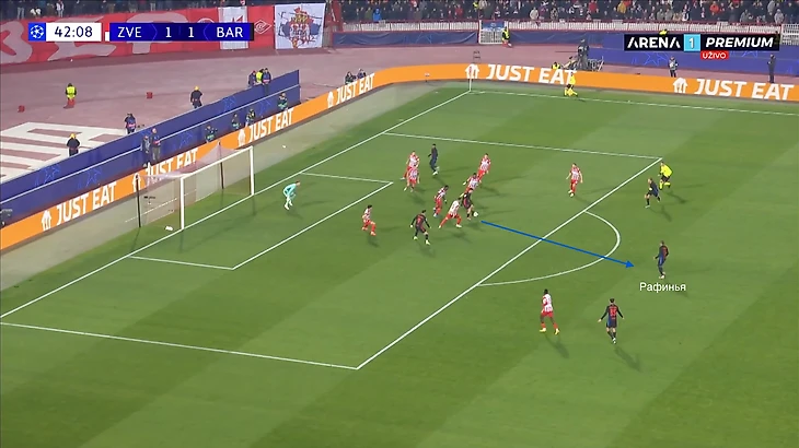 Например, здесь Рафинья опустился ниже, получил мяч и нашел передачей Ямаля на правом фланге. После включился в атаку, из глубины поднимаясь в опорную зону соперника.
