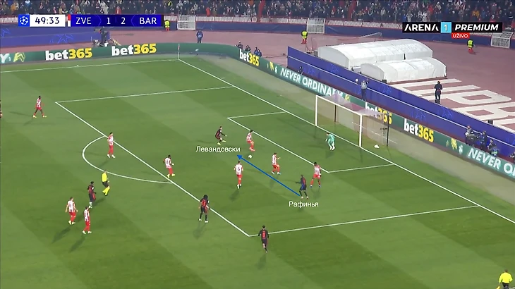 Здесь Кунде, в свою очередь, тоже принимает рациональное решение использовать второй темп атаки. В центре штрафной все перекрыто, Левандовски один, вариантов больше нет. Рафинья из глубины открывается под передачу и отправляет мяч в угол ворот соперника.
