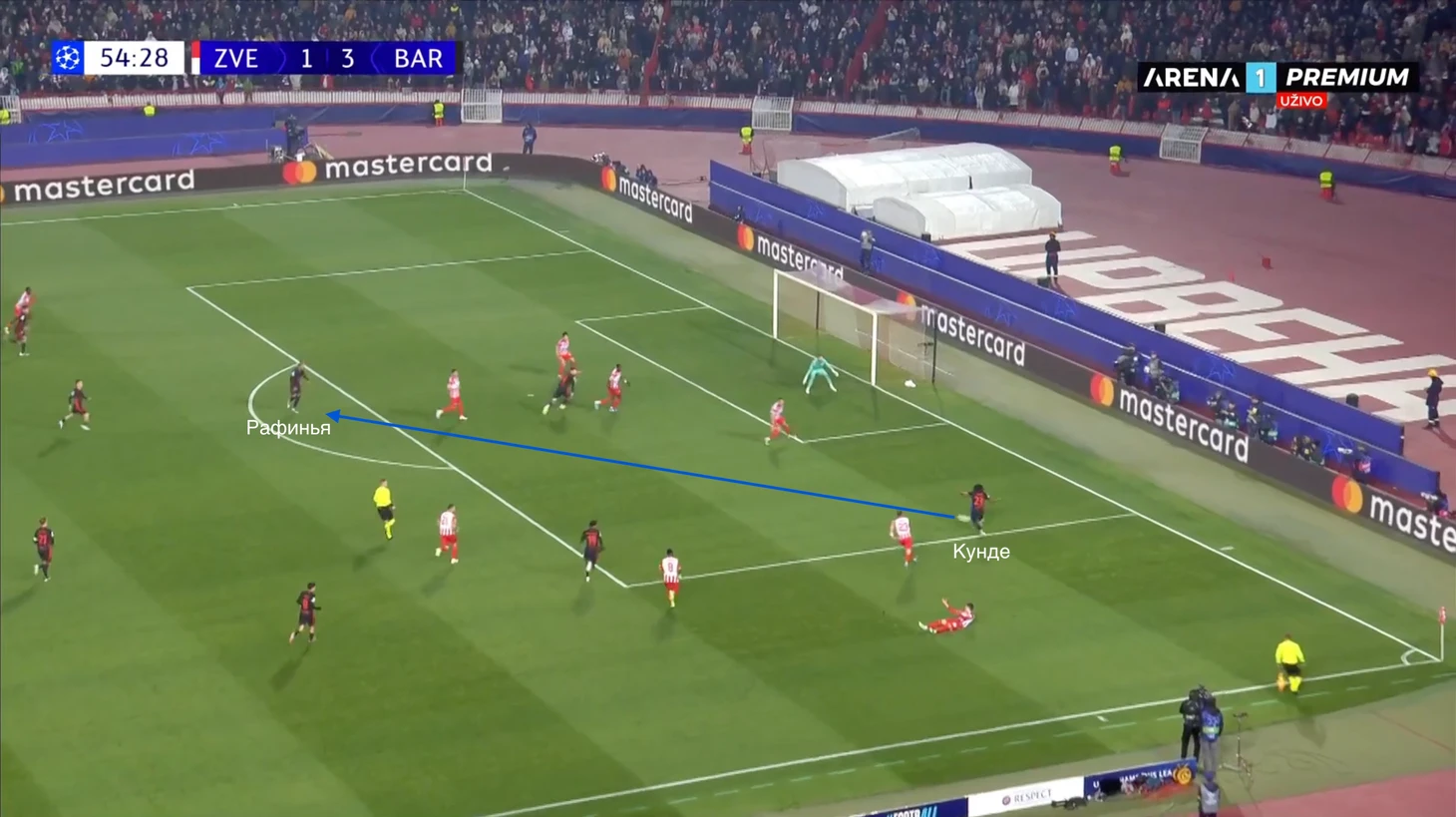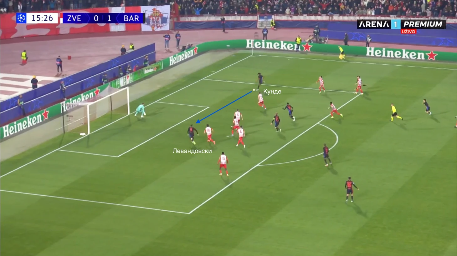 В результате, Кунде получил возможность отдавать голевую передачу на Левандовского, но направить мяч вдоль ворот у француза не получилось, опасный момент был упущен.