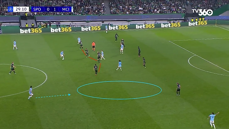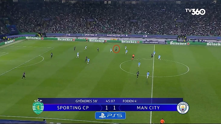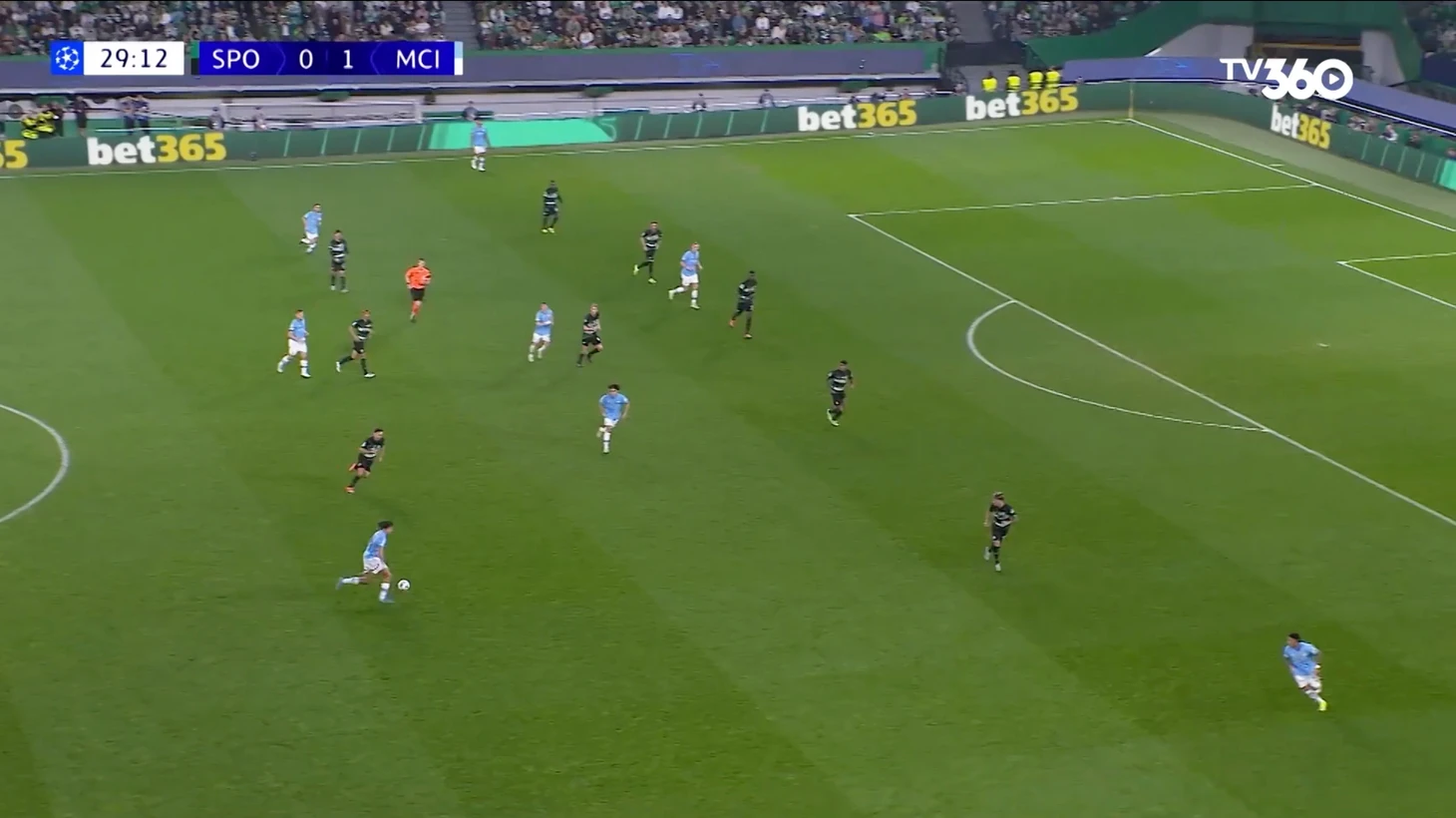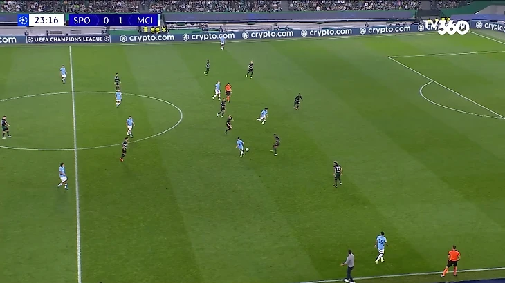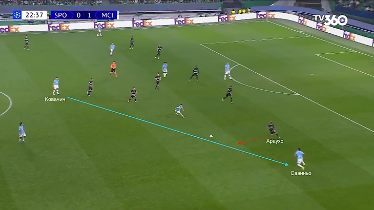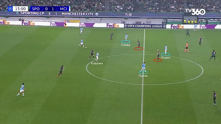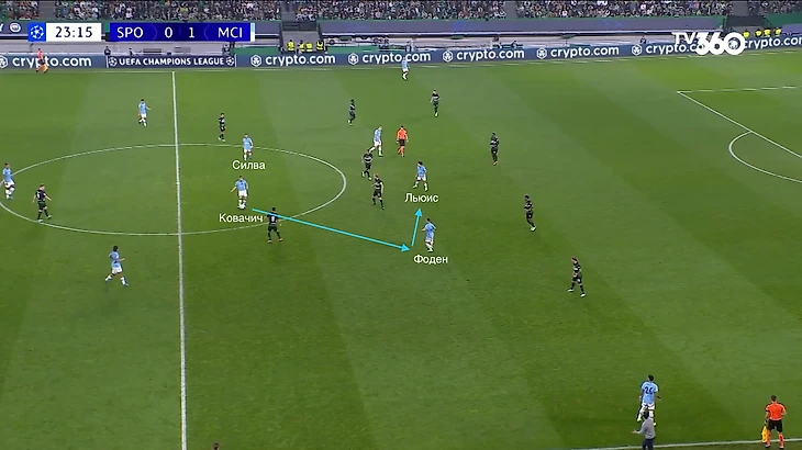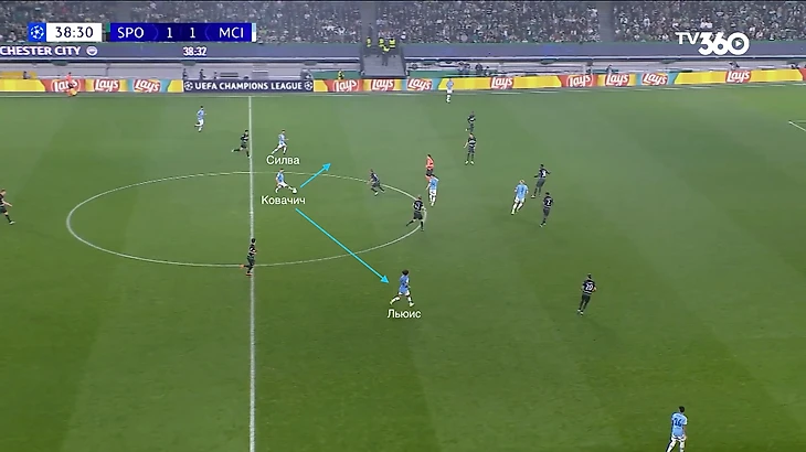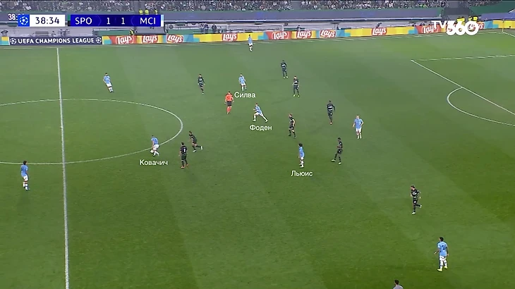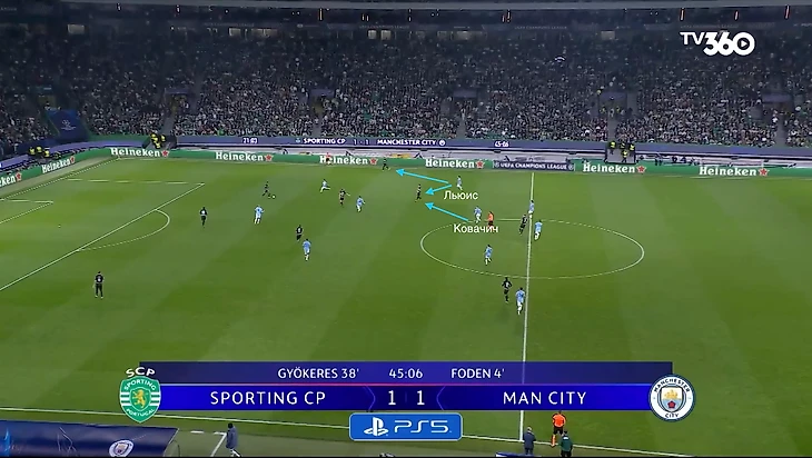 Ковачич на мяче и имеет возможность отдать конструктивную передачу на Фодена. Если сделать её своевременно, она проходит в данном эпизоде. При приёме мяча Фил попал бы в ситуацию 2v1 против латераля «Спортинга», образуя связь с Савиньо. Однако, Ковачич не рискнул отдать передачу, либо не увидел потенциального адресата.