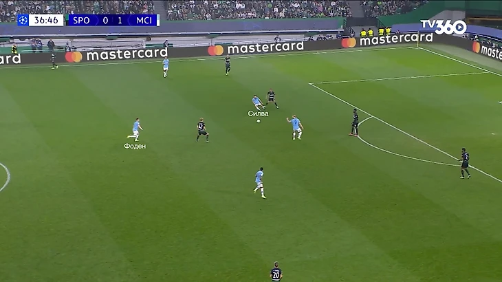 Однако, на правом фланге конвертировать это в опасные эпизоды у «Сити» не получилось. На левом же фланге, когда «Спортинг» по длинной диагональной передаче в свой правый фланг садился в низкий блок, либо когда «горожане» через циркуляцию мяча заходили в финальную треть, там активно подключался Гвардиол для взаимодействия с партнерами по левосторонней зоне.