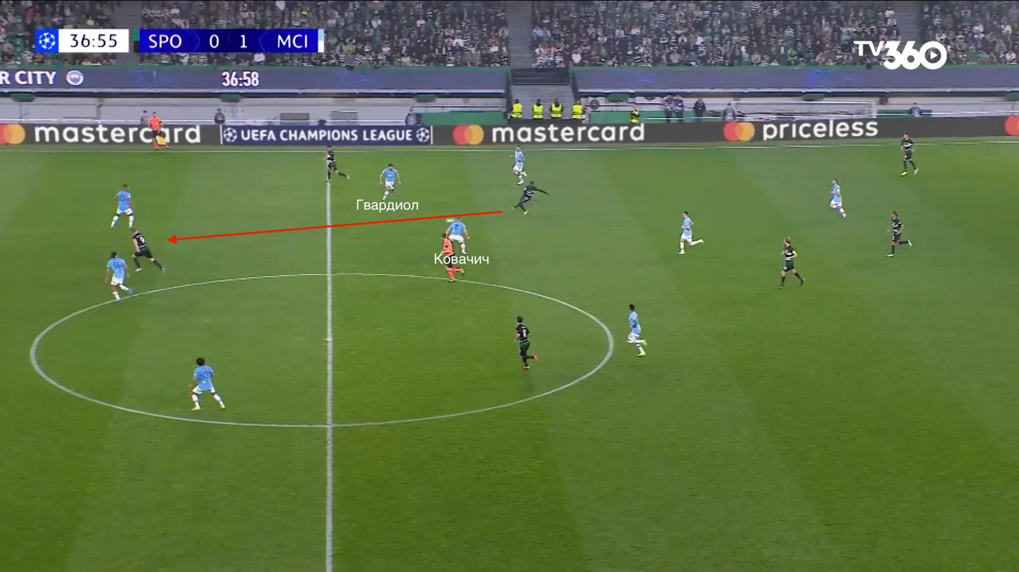 Ковачич сместиться в левый полуфланг уже не успевает, это даёт возможность латералю «Спортинга» на приёме мяча уйти в центр, поймав тем самым Гвардиола на противоходе, выиграв себе немного времени, но достаточного, чтобы найти коридор для передачи на своего нападающего.