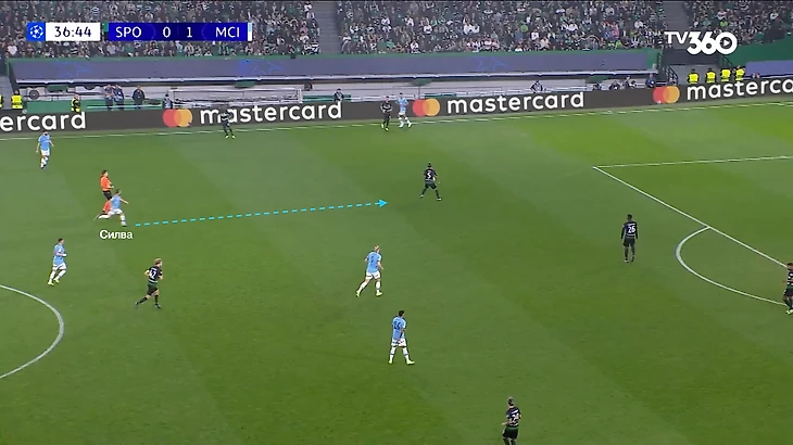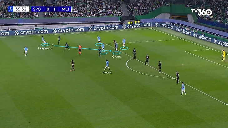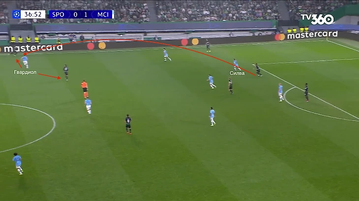 Второй пример, когда Гвардиол в результате перегруза фланга нашёл передачей Силву. Эпизод закончился опасным ударом в дальний угол вратаря «Спортинга».