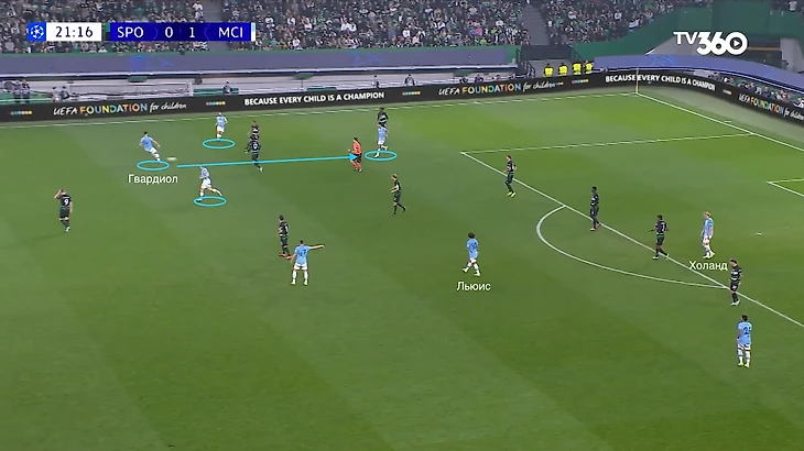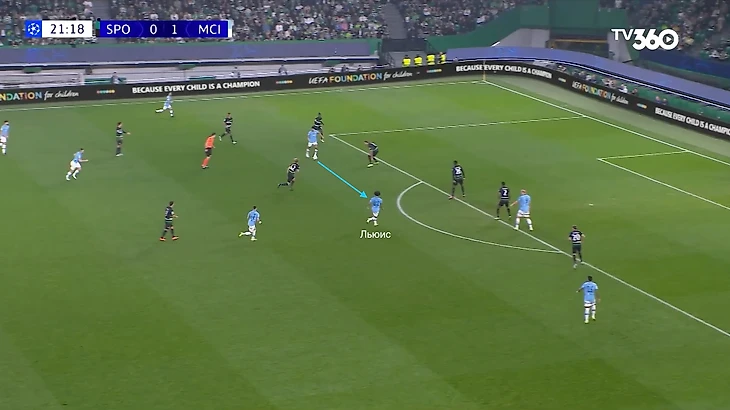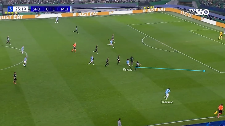 Льюис с мячом дополнительно ещё и стянул на себя двух игроков обороны соперника, тем самым открыв большое пространство для Савиньо, и сумел отдать ему проникающую передачу. Бразилец зашел с мячом в штрафную, но доставить его до Холанда ему не удалось. Стоило сыграть чуть смелее и вертикальнее в центре, и сразу же получился опасный момент.