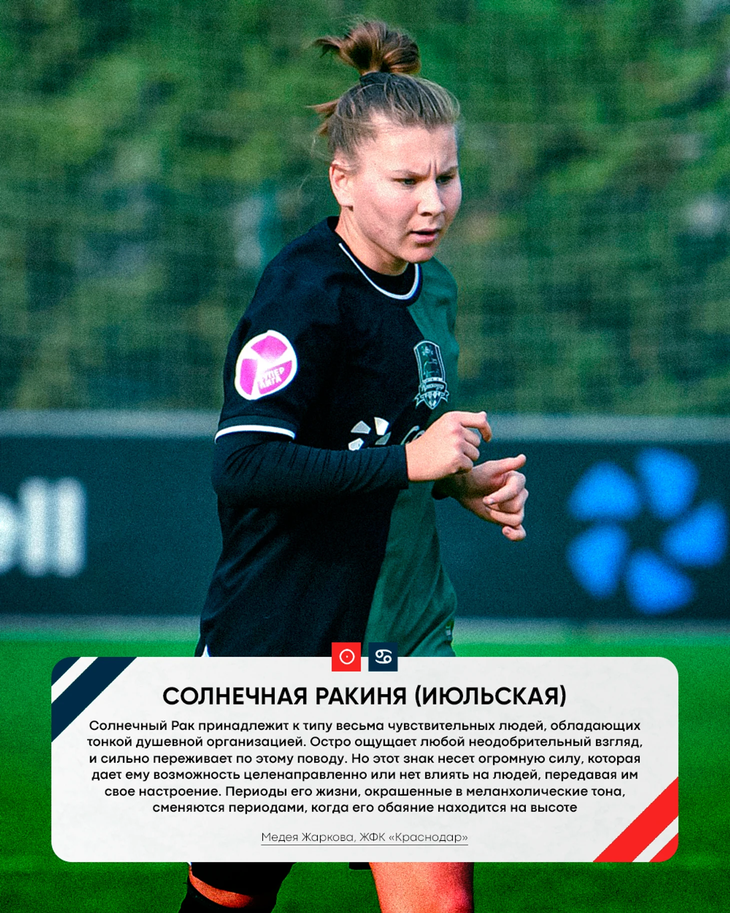 Да, не удивляйтесь присутствию девушки в мужской сборной по футболу. По мнению эксперта Иванченко, нужна девушка-полузащитница, которая будет «полуатаковать, полузащищать». Звезды говорят, что человек, родившийся в знаке Рака, «несет в себе огромную внутреннюю силу, которая помогает ему во взаимодействии с людьми».
