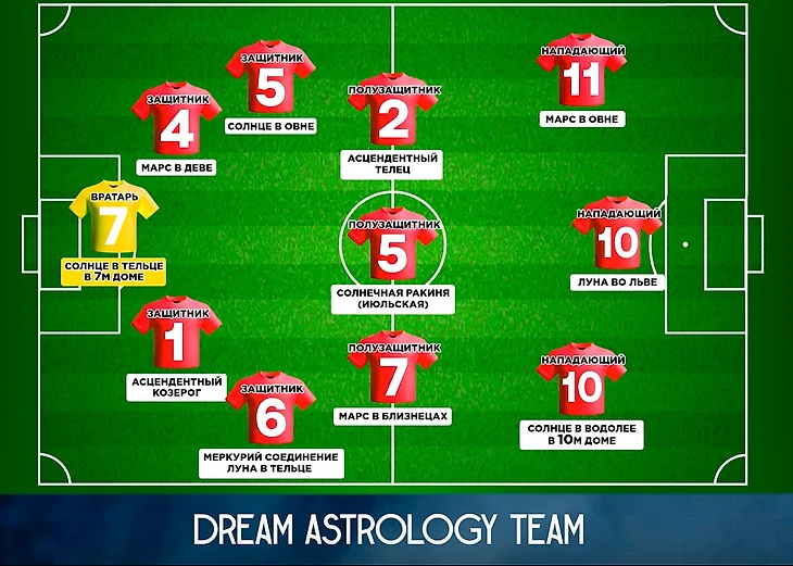 Автор пофантазировал, заглянул в натальные карты более 60 игроков, чтобы найти подходящих, оценил достойные предложения и нашел (с очень серьезными усилиями) 11 подходящих кандидатов на данные позиции. Просьба – не судите строго, а лучше судите с юмором, за точность не ручаемся (поскольку время рождения неизвестно, то брались стандартные 12:00, что могло повлиять на результат).