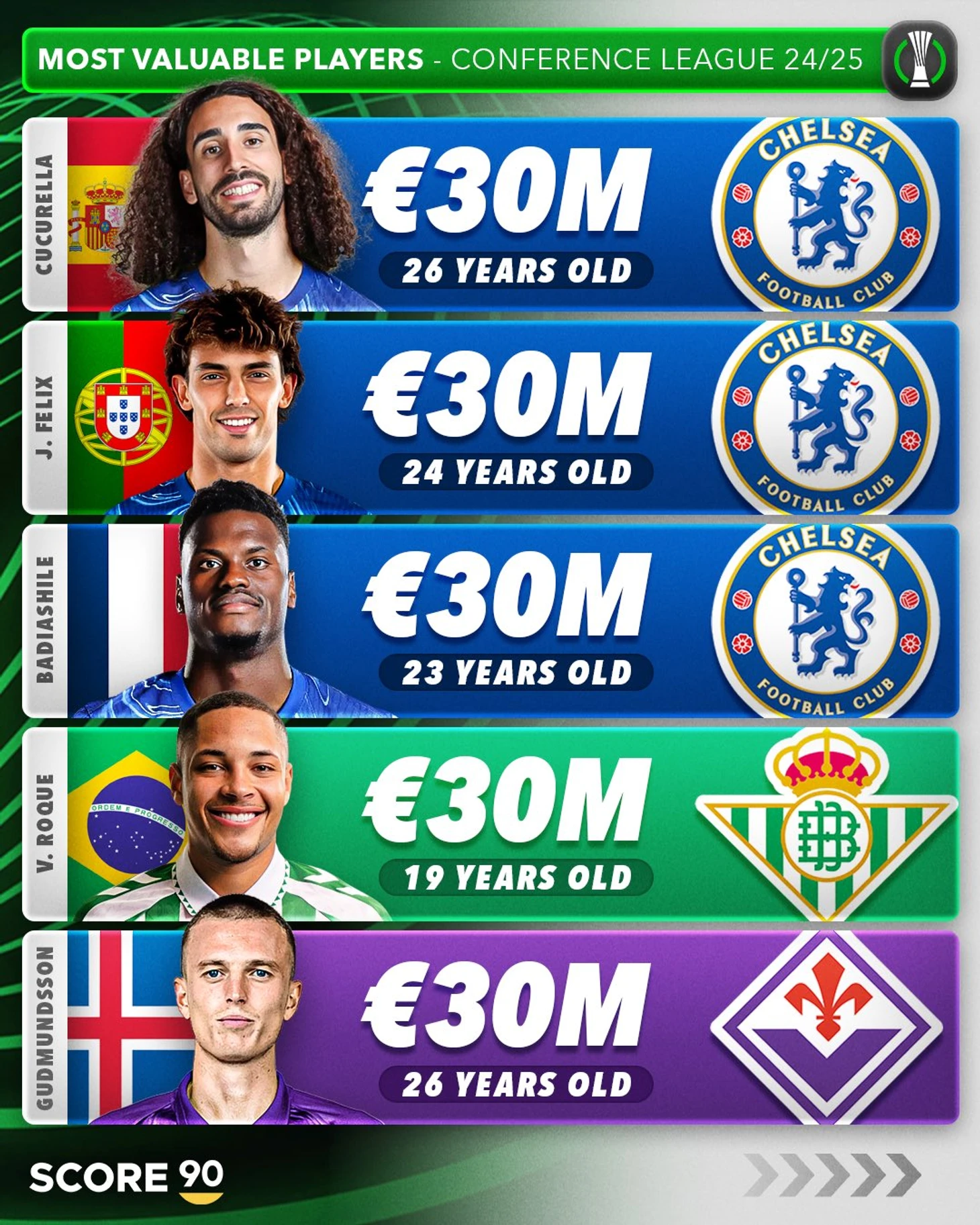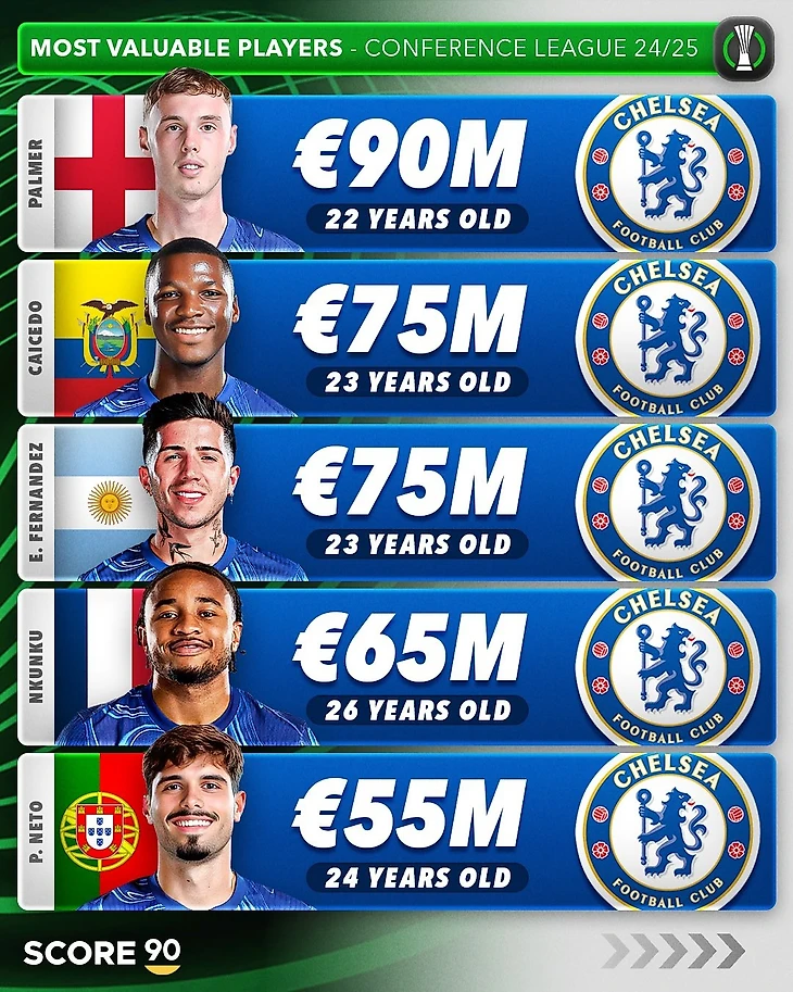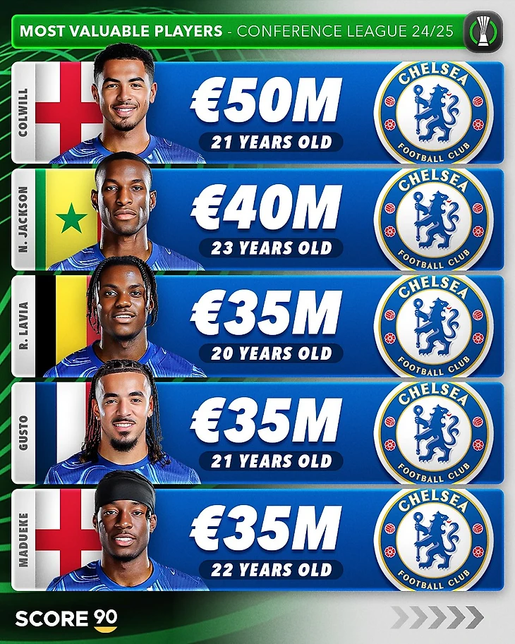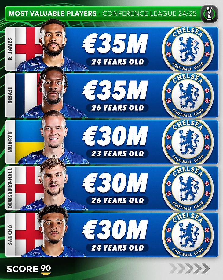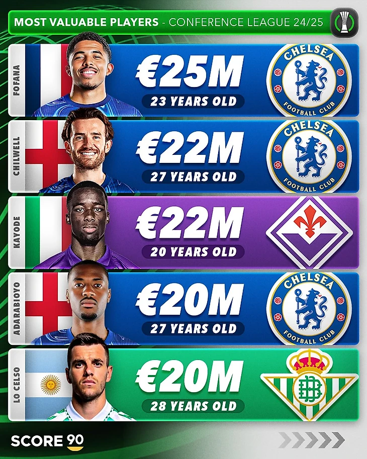 В топ-25 самых дорогих футболистов Лиги конференций вошел 21 игрок «Челси». Лишь четверо спортсменов в рейтинге не представляют «синих»: Витор Роке («Бетис»), Альберт Гудмундссон («Фиорентина»), Майкл Кайоде («Фиорентина») и Джовани Ло Чельсо («Бетис»).