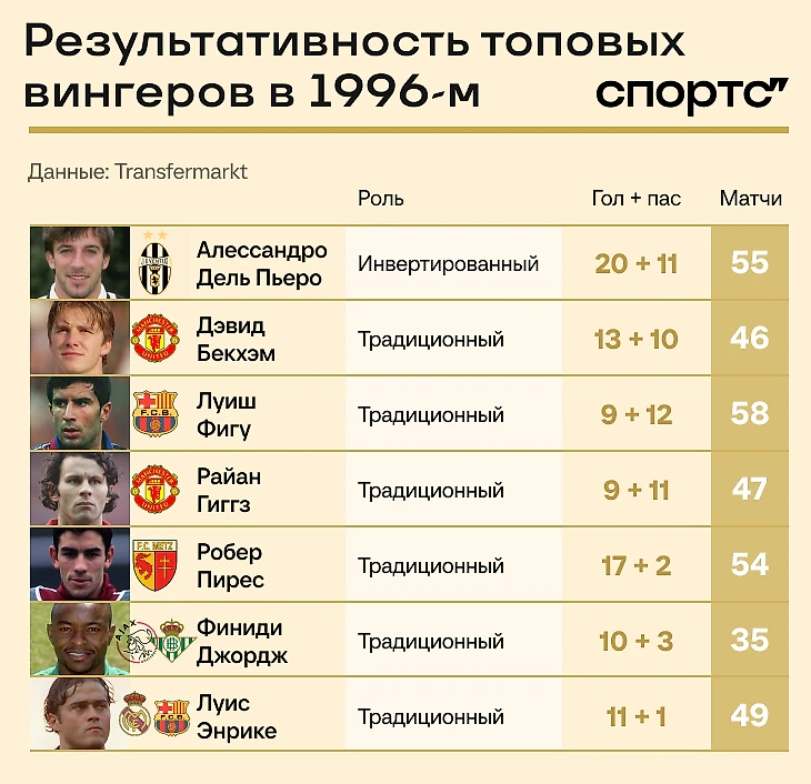 Эта эффективность особенно поражала на фоне традиционных крайков. Дель Пьеро играл в самой сложной и закрытой лиге, которую можно представить, и ЛЧ. Линейные вингеры, носившиеся до лицевой в турнирах попроще, все равно уступали в результативности.