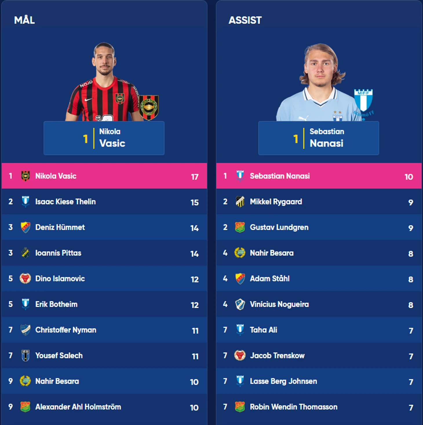 Себастьяна Нанаси так никто и не смог подвинуть с вершины таблицы ассистентов за 11 туров. Три крайних защитника в топе — Адам Штоль из «Юргордена», Винисиус Ногейра из «Хальмстада» и Робин Томассон из «ГАИСа». И еще два игрока «Мальме» — одни из лучших ассистентов сезона — Таха Али и Лассе Берг Йонсен.