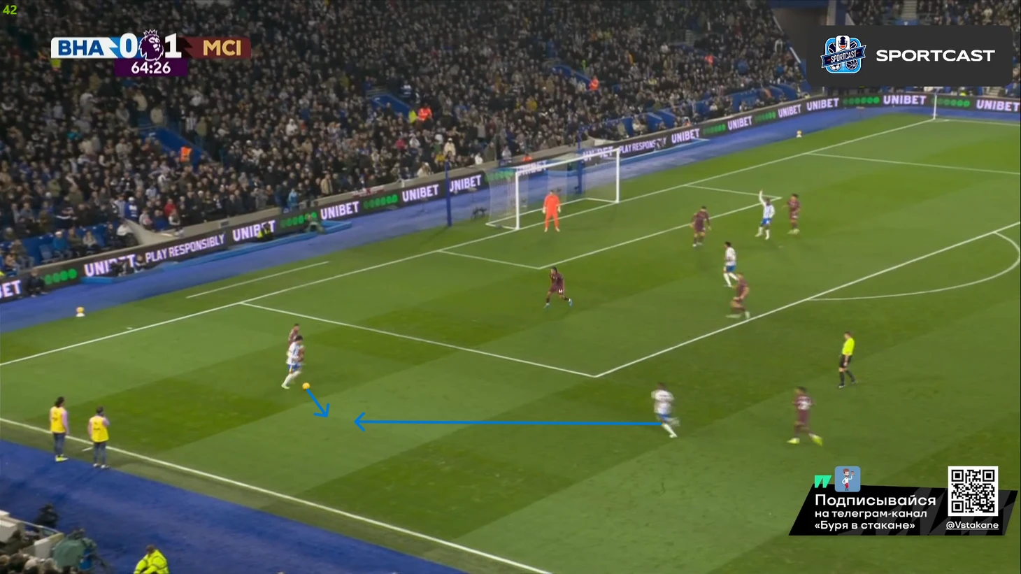 В концовке тайма же, главный тренер «Брайтона» решил запутать всех, в преддверии второй половины, еще больше ведь с минуты эдак 35-й вновь включился серьезный прессинг хозяев, которые тут же перестроились на 4-4-2 без мяча и 3-5-2 с ним (тоже самое было в начале), что практически сразу же дало эффект в виде момента Уэлбека, ведь «горожане» уже тогда, будто бы, начали чуть выдыхаться, а агрессия соперника в действиях без мяча все возрастала и достигла апогея в районе 42-й минуты (скрин именно оттуда), но в первом тайме это больше не приводило ни к каким серьезным шансам