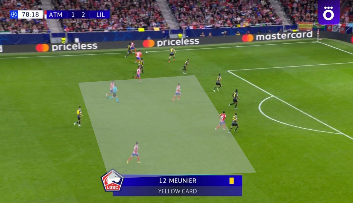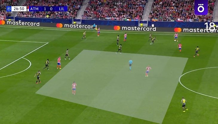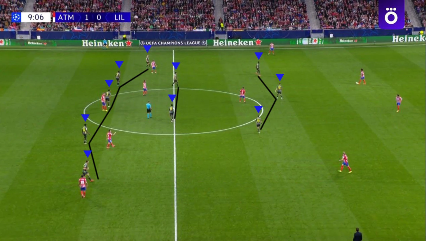 Когда игрок «Лилля» находился с мячом на фланге, крайний защитник «Атлетико» выдергивался к нему; к ним двигался и крайний центральный полузащитник, а центральный центральный полузащитник смещался в их сторону и готов был страховать.