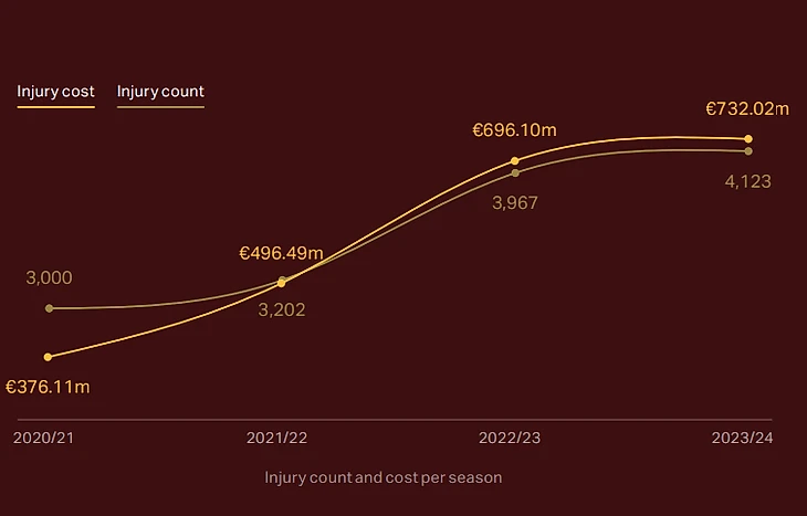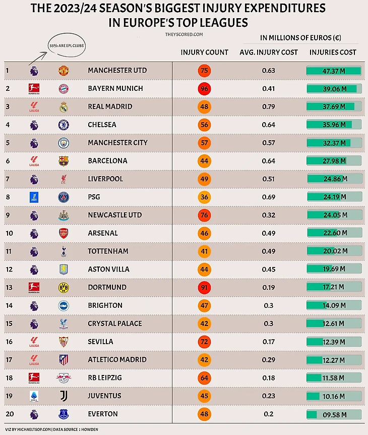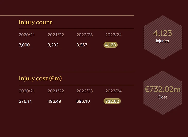 Проект Howden Insurance выпустил ежегодный индекс футбольных травм в топ-5 лиг Европы. Под анализ попали 96 команд из АПЛ, Ла Лиги, Серии А, Бундеслиги и Лиги 1.