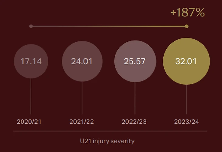И еще один неприятный момент − за последние четыре гола практически в два раза (на 187%) выросло количество травм у игроков не старше 21 года. Их все чаще и раньше привлекают к игре в стартовом составе и дают большие нагрузки.
