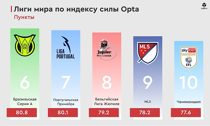 А сразу за топ-пятеркой неожиданно расположилась бразильская Серия А. Все благодаря тому, что в прошлом году бразильский «Флуминенсе» выиграл Копа Либертадорес (а в полуфинале играли три клуба Серии А), а в этом году сразу две команды прошли в финал. Вторая неевропейская лига среди 10 самых рейтинговых – американская МЛС, занимающая девятое место.