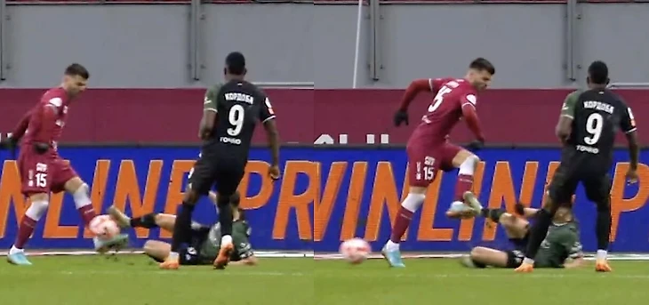 Вообще ничего спорного, это неправда. Более того, это бы фол даже если бы Сперцян не коснулся соперника. Это все равно бы была опасная игра, только свободный удар, а не штрафной и без ЖК. А раз касание был, то вот так.