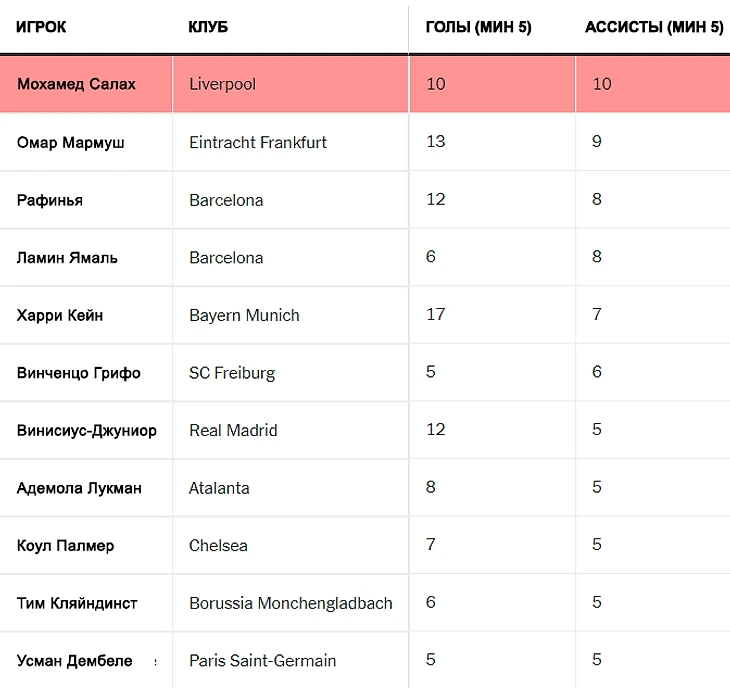 Салах стал первым игроком в пяти крупнейших европейских лигах, которому удалось зарегистрировать двузначные показатели по голам и передачам во всех соревнованиях в этом сезоне.