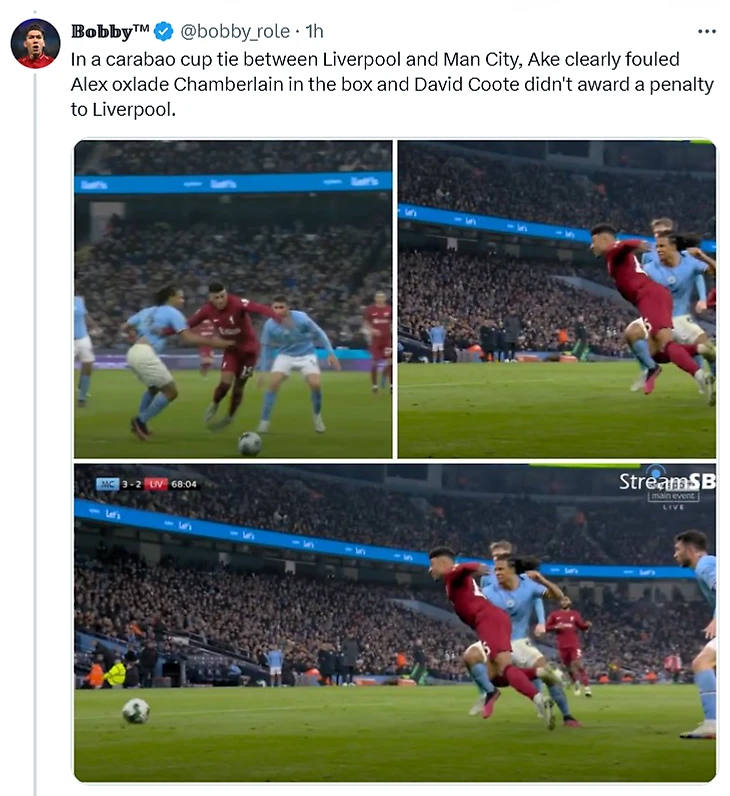 💭 «В матче Кубка лиги между «Ливерпулем» и «Ман Сити» Аке явно сфолил на Алексе Окслейд-Чемберлене в штрафной, а Дэвид Кут не дал «Ливерпулю» право на пенальти».