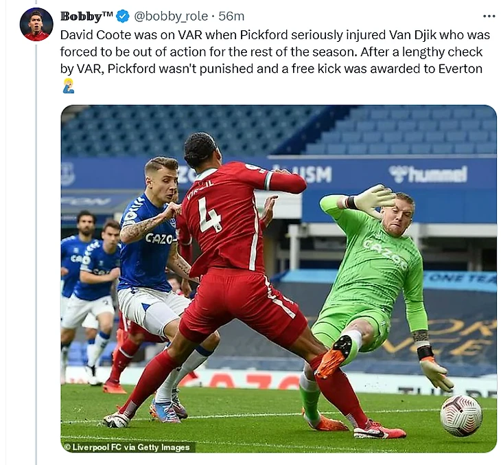 💭 «Дэвид Кут был на VAR, когда Пикфорд серьезно травмировал Ван Дейка, который выбыл из строя до конца сезона. После продолжительной проверки VAR Пикфорд не был наказан, а «Эвертон» получил свободный удар».