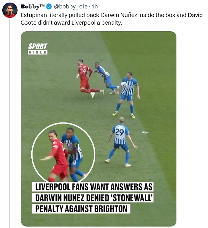 💭 «Эступиньян буквально сбил Дарвина Нуньеса в штрафной, Дэвид Кут не дал «Ливерпулю» пенальти».
