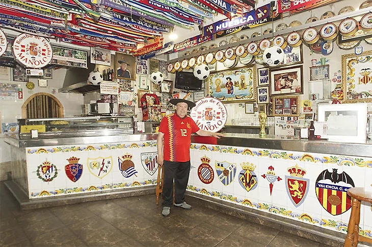 Бар Tu Museo Deportivo (с исп. «Твой музей спорта») не только заведение, где можно выпить пива с тапас, традиционными испанскими закусками, – владелец превратил место рядом с «Местальей» в настоящий музей футбола. На барной стойке – эмблемы клубов Ла Лиги. Под потолком – шарфы. На стенах – фотографии знаковых побед и, конечно, барабаны, с которыми Маноло ходил на стадионы по всему миру.