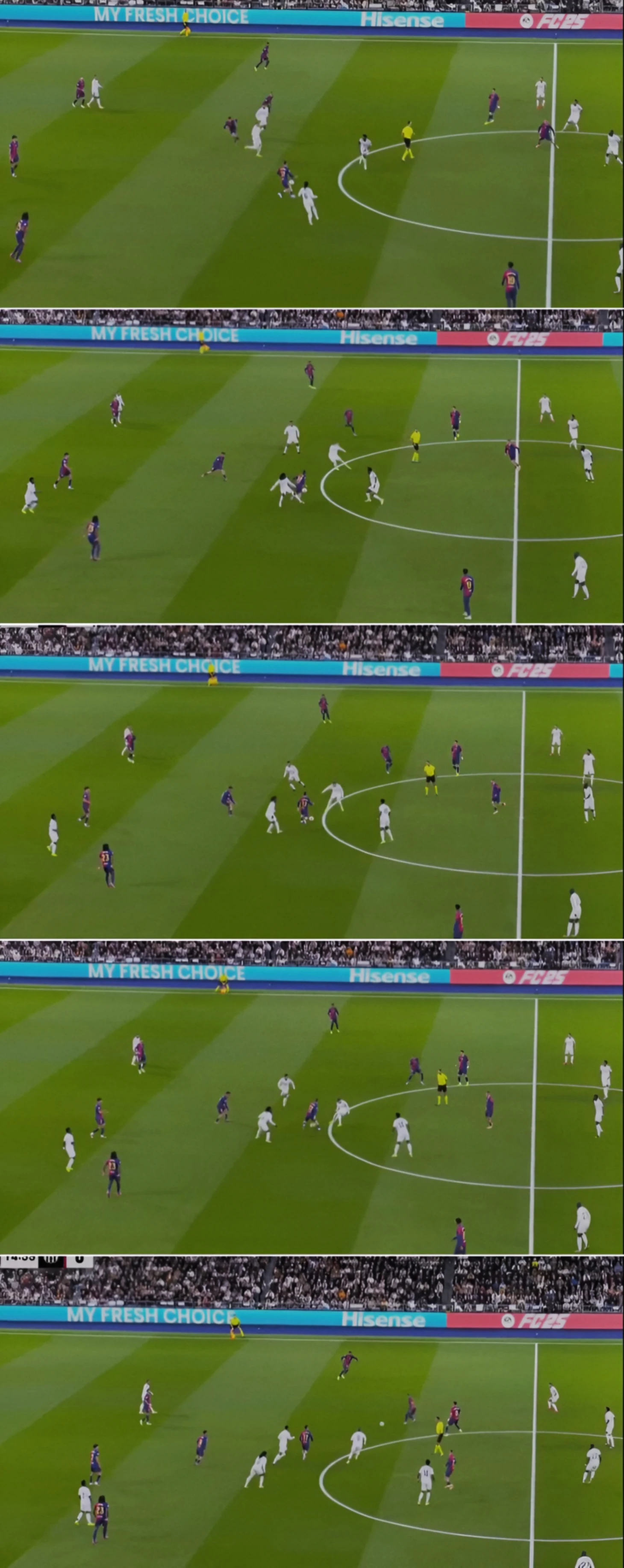 Касадо всегда сканирует поле, чтобы в критических ситуациях иметь верное решение и быстро принять его. Как уже говорилось ранее, он прессингоустойчив. В данном эпизоде ему пришлось принимать мяч под прессингом двух игроков «Реала», Марк спокойно убрал одного на принятии мяча, а от второго ушел в глубокую зону, куда Рюдигер(центральный защитник) не мог пойти, ведь в таком случае бросил бы свою зону в центре защиты.