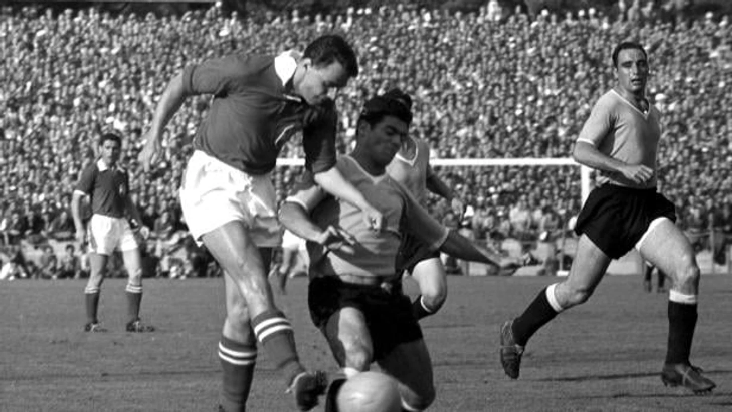 В 1954 г., Австрия все еще была оккупированной союзниками страной. В альпийском государстве медленно, но верно шла денацификация, а ее руководство вело переговоры с ведущими державами о независимости. Но несмотря на это все-таки приняла участие на мундиале, благо и ехать далеко команде было не нужно; всего лишь беспрепятственно пересечь свою западную границу в районе бундесланда Форарльберг. Австрия попала в одну группу с Уругваем, Чехословакией и Шотландией. Будучи сеяной сборной, австрийцы минимально обыграли «тартановых», а ЧССР был учинен разгром 5:0. Времена Вундертим Хуго Майсля уже были давно позади, но даже после войны Австрия оставалась одной из ведущих сборных в европейском и мировом футболе. Но любопытно вот что: за весь XX в. австрияки ни разу пробивались в финальную часть Евро; дебют состоялся лишь в 2008-м, в то время как на ЧМ команда отбиралась регулярно. Тем не менее Рот-Вайсс-Рот заняли второе место в группе, пропустив вперед себя только Уругвай, у которого помимо отсутствия пропущенных мячей оказалось на 3 забитых больше (2:0 с ЧССР и 7:0 – с Шотландией). Чехословаки и скотты ни очков не набрали, ни мячей не забили. В четвертьфинале «селесте» прошли англичан 4:2, но в полуфинале уступили мадьярам с тем же счетом и получили право лишь на бронзовый финал.
