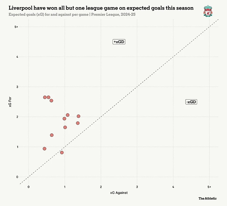 Хотя им еще предстоит встретиться с «Манчестер Сити», занимающим второе место, они уже столкнулись с четырьмя соперниками, занимающими места с третьего по шестое в таблице. И они играли хорошо. С одной стороны, цифры говорят о том, что «Ливерпулю» повезло не пропустить больше голов. Алиссон и Куивин Келлехер совершили важные сейвы в этом сезоне. Но те же цифры показывают, что «Ливерпуль» создал больше моментов, чем его соперники, в каждом матче этого сезона, за очень небольшим исключением — выездным матчем с «Арсеналом», когда ничья была и справедливым отражением баланса игры, и хорошим результатом для команды Слота.