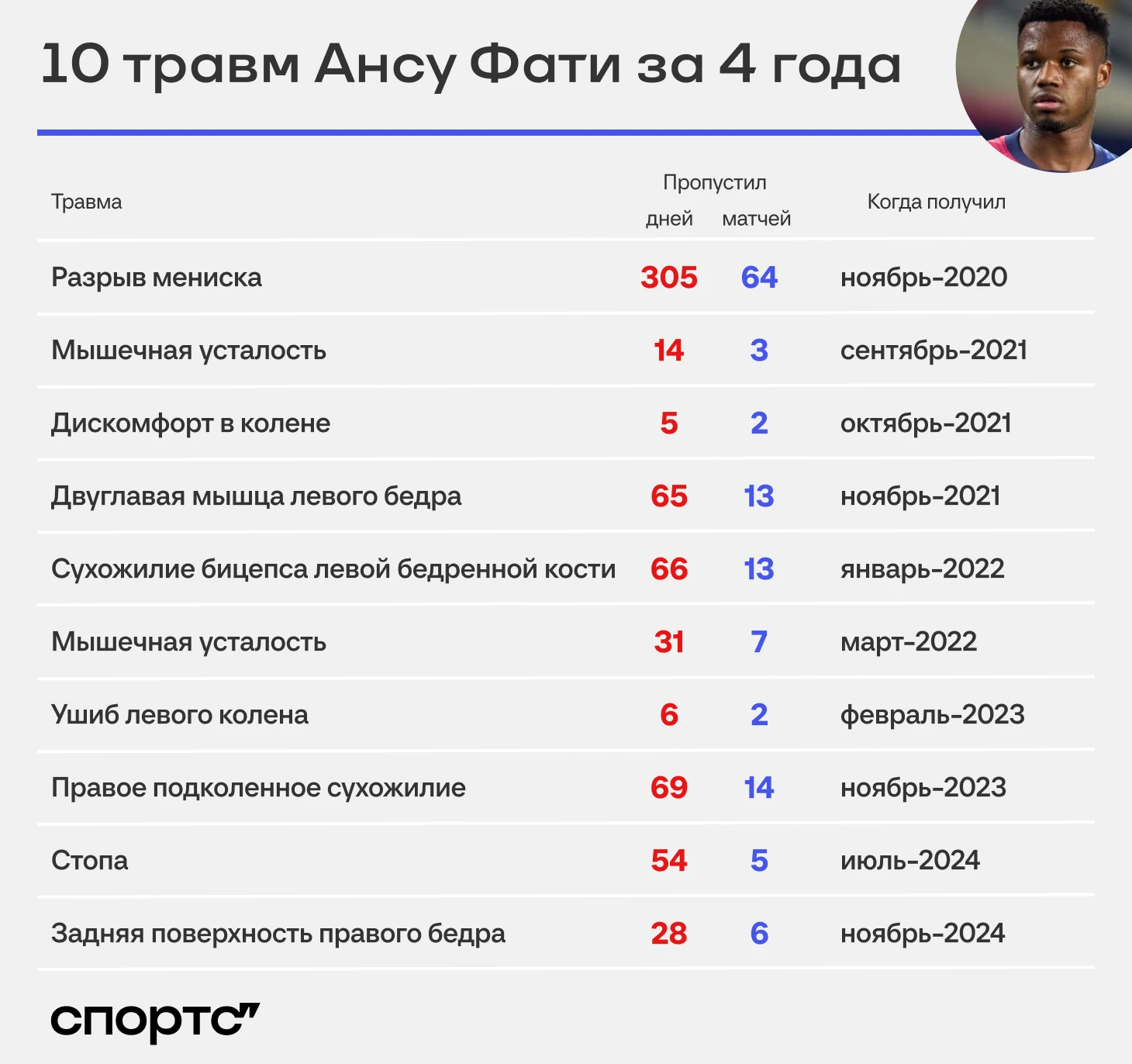 У Фати уже 10-я травма за 4 года. Продолжают ломать карьеру