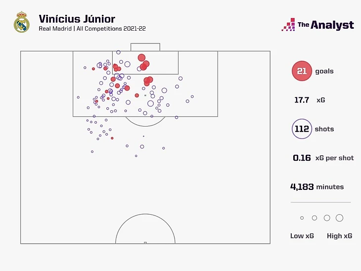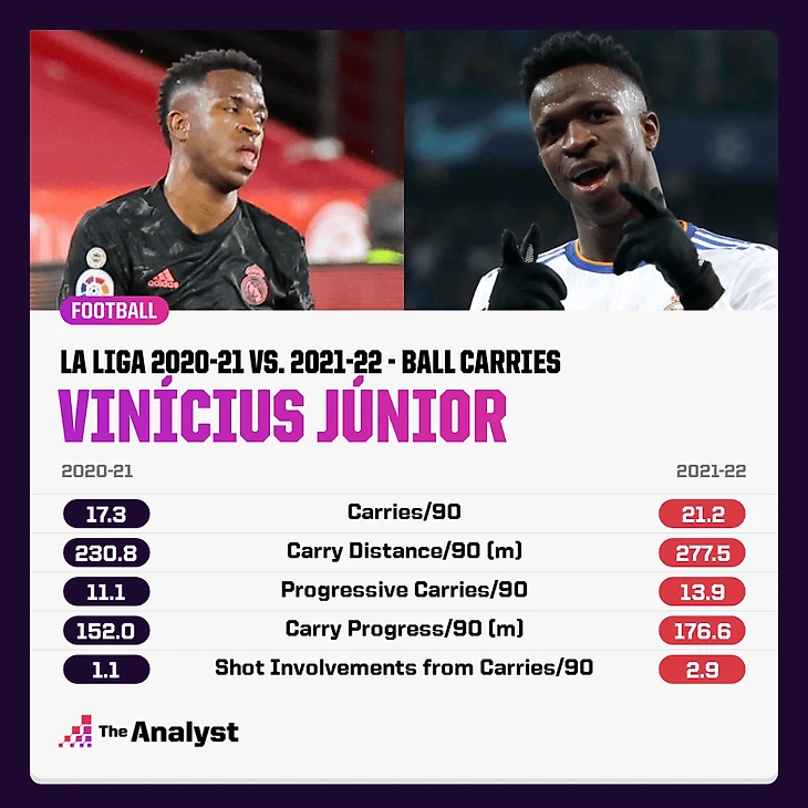Его результативность сделала качественный и количественный скачок, который ему еще предстоит сделать в составе Бразилии. Сравнение статистики Винисиуса в Ла Лиге в сезонах 2020-21 и 2021-22 показывает, насколько быстро он улучшился. В обоих сезонах он принял участие в 35 матчах лиги — по 22 и 30 соответственно в качестве стартового игрока.