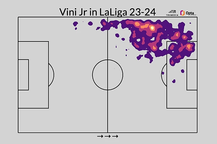 Вместо того, чтобы играть широко слева в тройке нападения, Винисиус сформирует с Родриго нетрадиционную пару в атаке без классического центрального нападающего, и Беллингемом позади них. Взгляд на тепловые карты последнего сезона Ла Лиги Винисиуса до прибытия Анчелотти, 2020-21, и последнего полного сезона, 2023-24, показывает изменение его позиции, теперь он чаще проникает в штрафную площадь и играет ближе к воротам.
