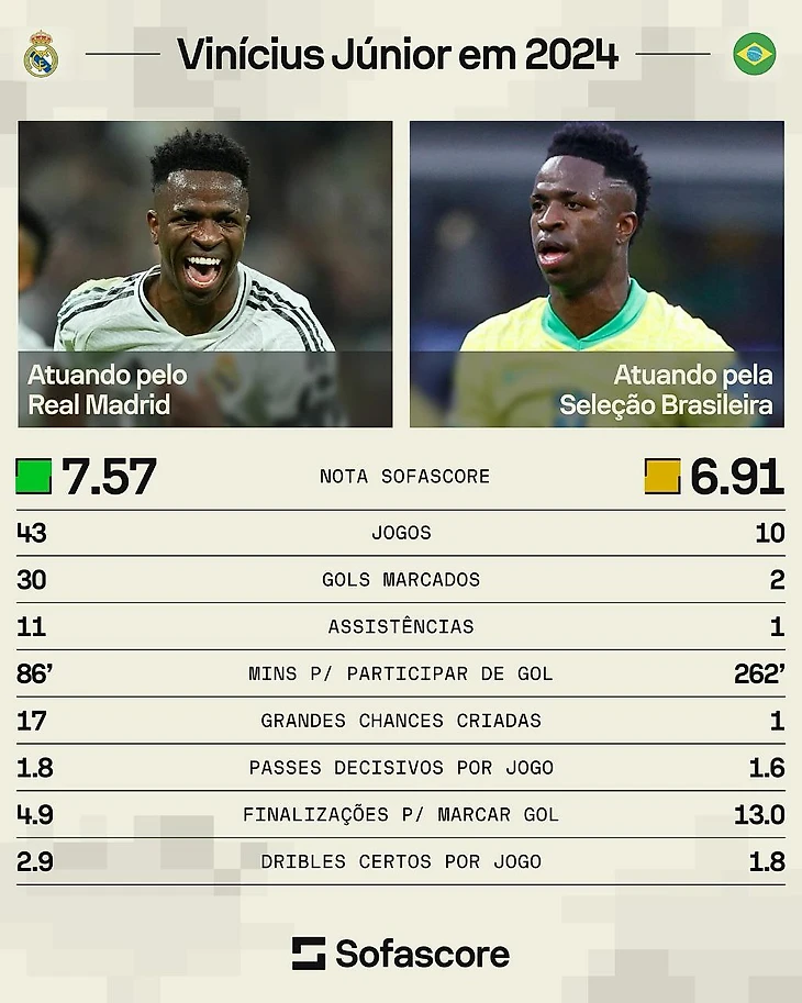 Несмотря на прибытие Мбаппе и присутствие Беллингема, Винисиус по-прежнему является ключевым игроком для «Реала», возможно, самого сильного клуба в мире, и является им уже несколько сезонов. Это делает его неспособность убедить Бразилию еще более загадочной.