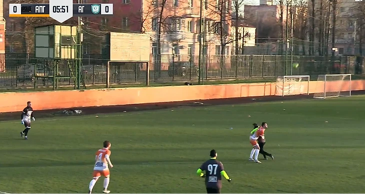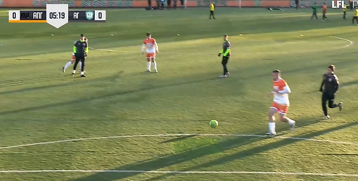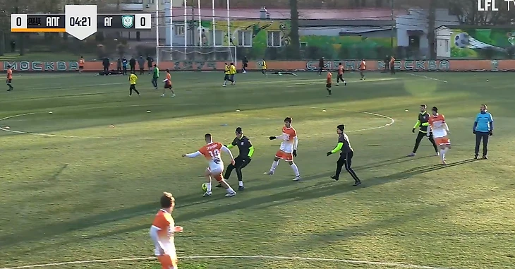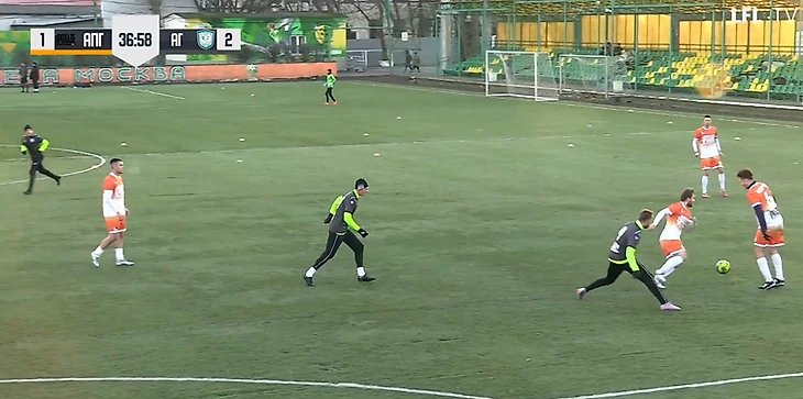 Снова поведя в счёте, соперник не отошёл от своего принципа предельно строгой игры в обороне. По-прежнему под плотной опекой находился Егорашев: ниже очередной пример этого, мяч только катится к Евгению от Моисеева, а того уже готовятся встретить два соперника.
