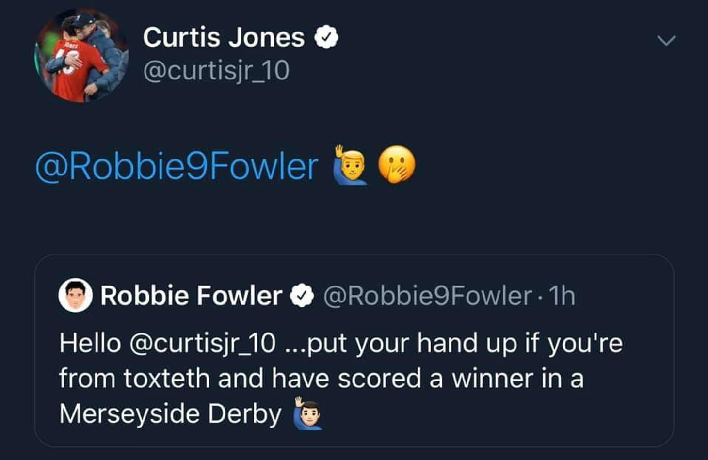 5 января 2020 года «Ливерпуль» встречался с «Эвертоном» в матче Кубка Англии. Команда Клоппа состояла из резервистов и игроков академии, в числе которых был Джонс. Полузащитник забил победный гол на 71 минуте, поразив ворота Пикфорда закрученным ударом с 20 ярдов. Кёртис в возрасте 18 лет и 340 дней стал самым молодым автором гола в мерсисайдском дерби со времен Робби Фаулера в 1994 году. Легенда «красных», уроженец Токстета, ответил на твит Джонса: «Подними руку, если ты из района Токстет и забил победный гол в Мерсисайдском дерби».